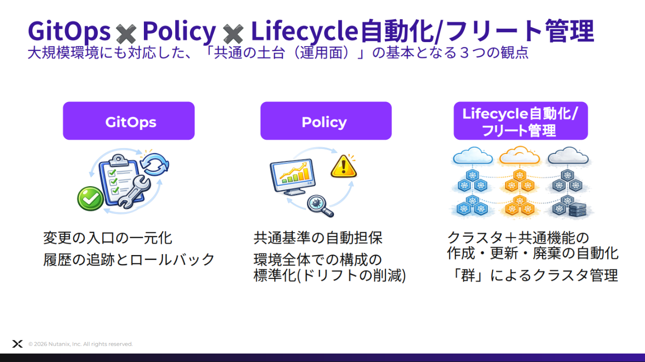 共通の運用作法を実現するために必要不可欠な3つの要素が、GitOps、ポリシー、ライフサイクル/フリート管理だ。