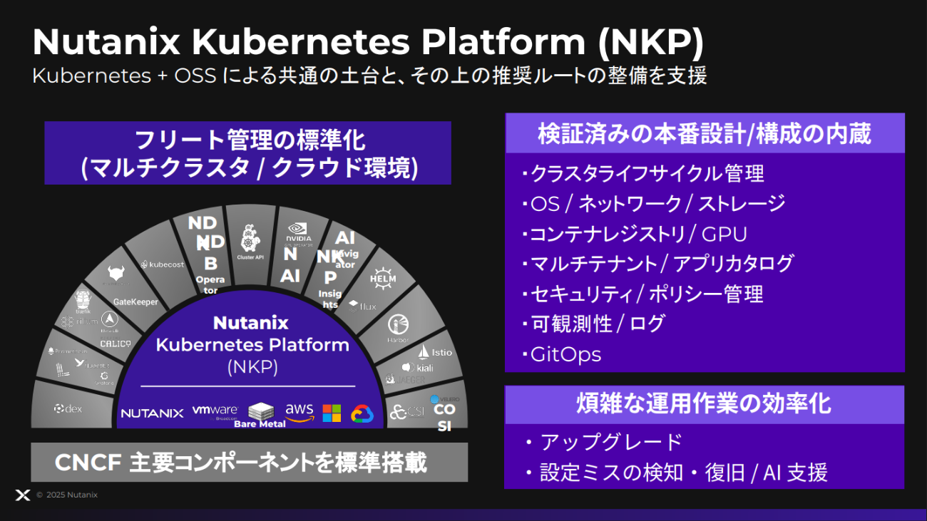 その技術は現在、Nutanix Kubernetes Platform(NKP)として結実している。NKPはクラスタのライフサイクル管理、セキュリティ/ポリシー管理、GitOps、可観測性などを標準搭載し、本セッションで紹介された共通プラットフォームと推奨ルート(Golden Path)の整備を一気通貫で支援するソリューションだ。
