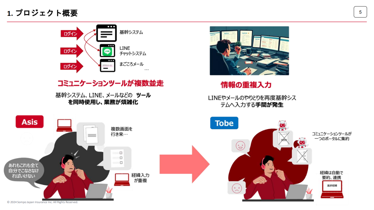 こうして開発してきた統合コミュニケーション基盤に、今度は生成AIを活用した機能を実装することになった。SOMPO Digital Lab 小林勇喜氏は「技術ドリブンな発想で作られたものは、結局現場で使われないことも少なくありません。そこで私たちは徹底した課題ドリブンを貫きました」と強調する。