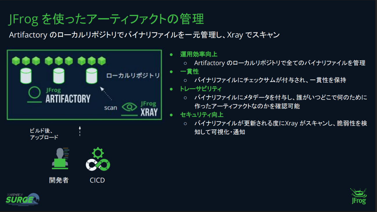 「ソースコードのビルド後に生成されるバイナリファイルを厳密に管理し、それに対して脆弱性スキャンを実行する。JFrogのプラットフォーム上でバイナリファイルを管理するため、SBOM作成にも同時に対応可能だ」(前田氏)