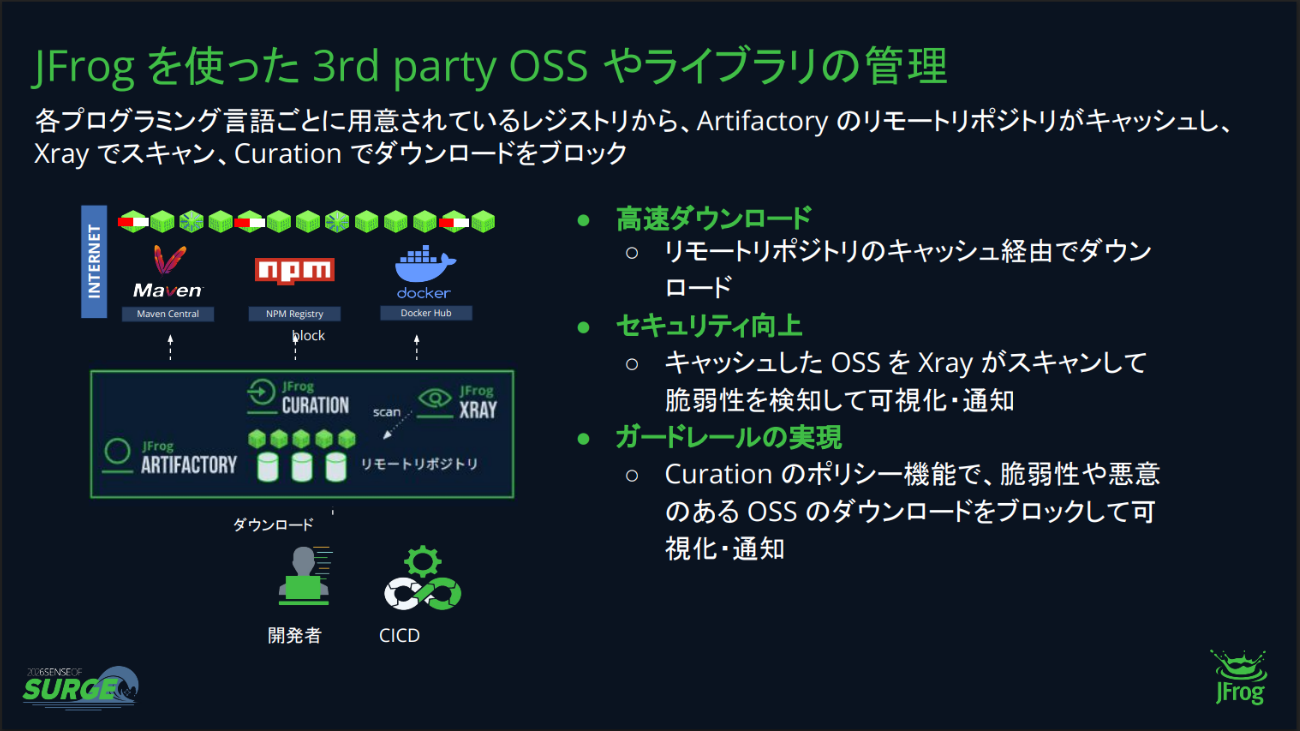 Artifactoryのリモートリポジトリ経由でオープンソースをダウンロードすると、初回はインターネット経由で直接ダウンロードしてキャッシュし、2回目以降はキャッシュ経由で高速にダウンロードすることが可能だ。また、リモートリポジトリにキャッシュされたOSSをXrayが自動的にスキャンして脆弱性を検知。さらにCurationを利用すれば、特定の条件、例えば「CVSSのスコアが9以上」や「悪意のあるパッケージ」といった危険なOSSのダウンロードをブロックすることもできる。