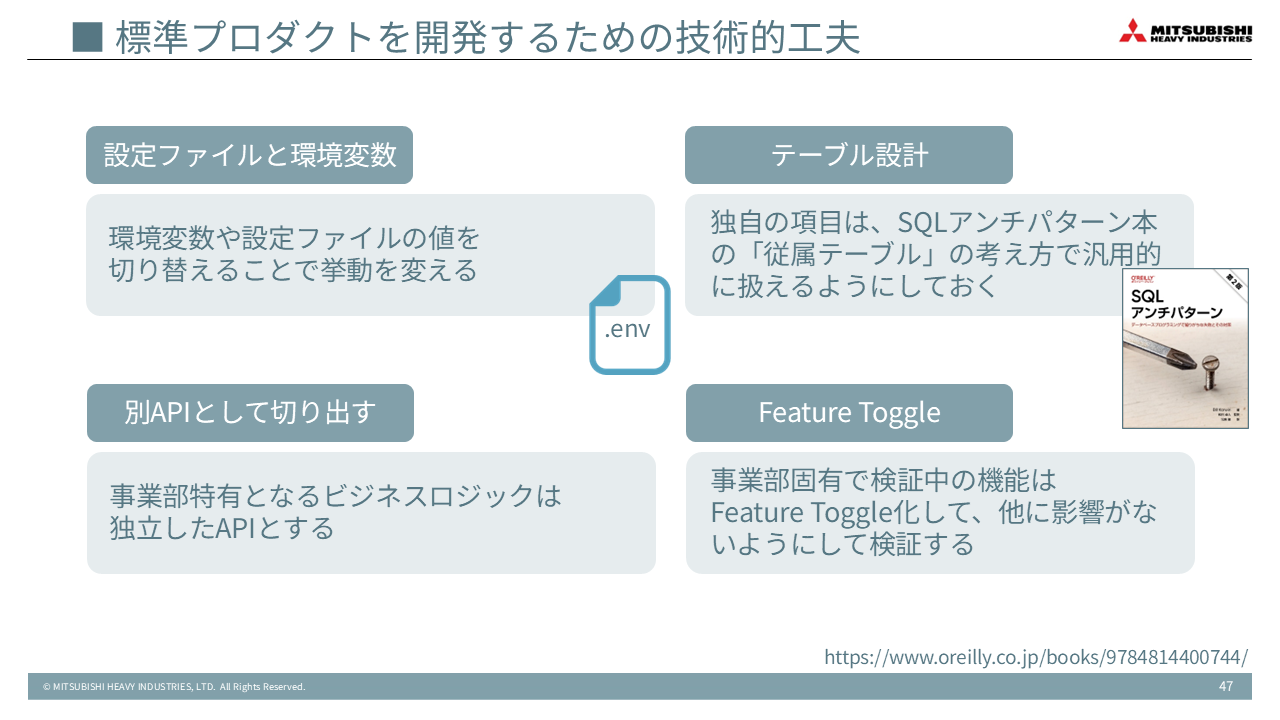 3つ目は事業部特有のビジネスロジックを設定ファイルで対処しようとするとif文が膨大になるケースに対し、割り切ってAPIごと独立させる判断だ。そして4つ目はフィーチャートグルで、事業部固有の検証中機能を他に影響を与えず追加・無効化できるようにしている。この4つの組み合わせが標準プロダクトの骨格を支えている。