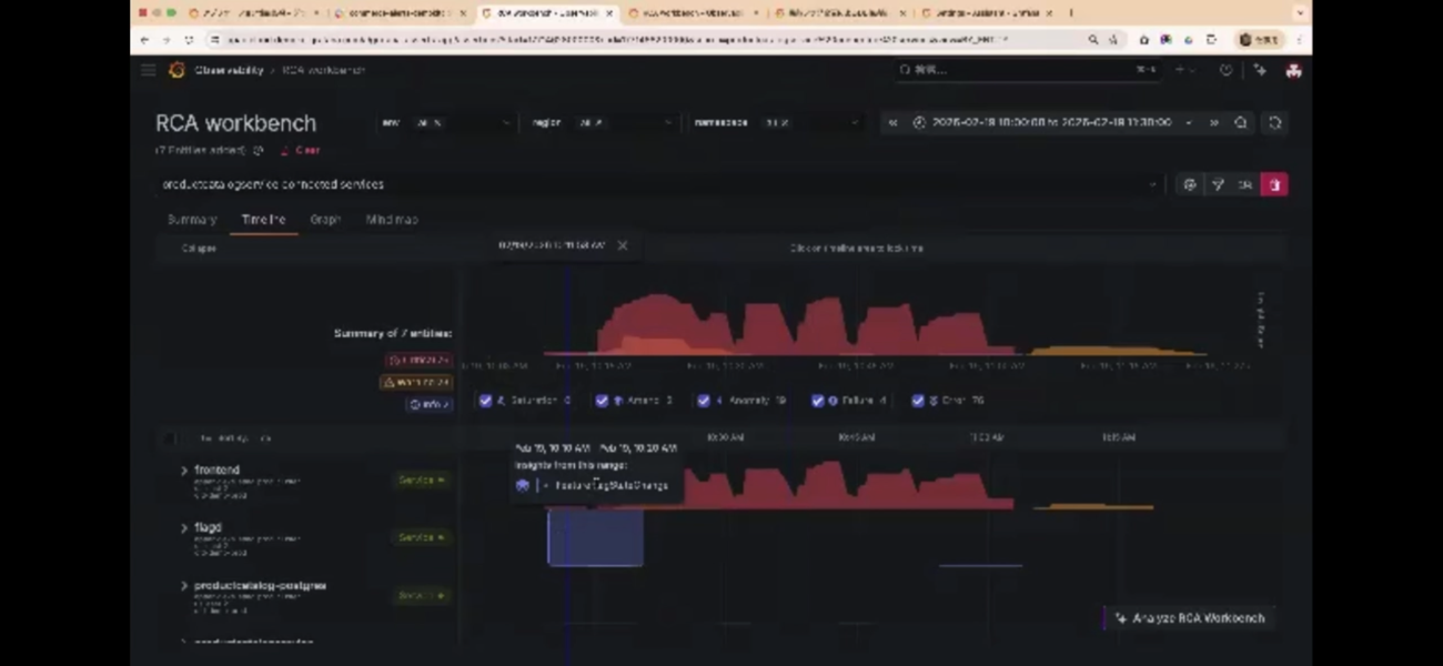 一般的には障害が起きると、メトリクスを確認し、ログを調べ、設定変更がないかを確認するなど、複数の画面を行き来して調査する必要がある。一方、Grafanaに実装されているRCA workbenchでは、障害の原因分析プロセスを1つのタイムラインで進めることができる。