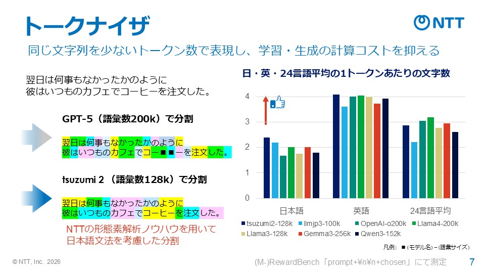 この仮説と課題意識に基づき開発されたのが、NTTの大規模言語モデル「tsuzumi」である。 tsuzumiは、四十年にわたるNTTの自然言語処理研究の知見を結集し、日本語の語彙や文章構造を極めて効率的に処理できる独自のトークナイザ(テキストをAIモデルが理解できる最小単位のトークンに分割する仕組み)を採用している。
