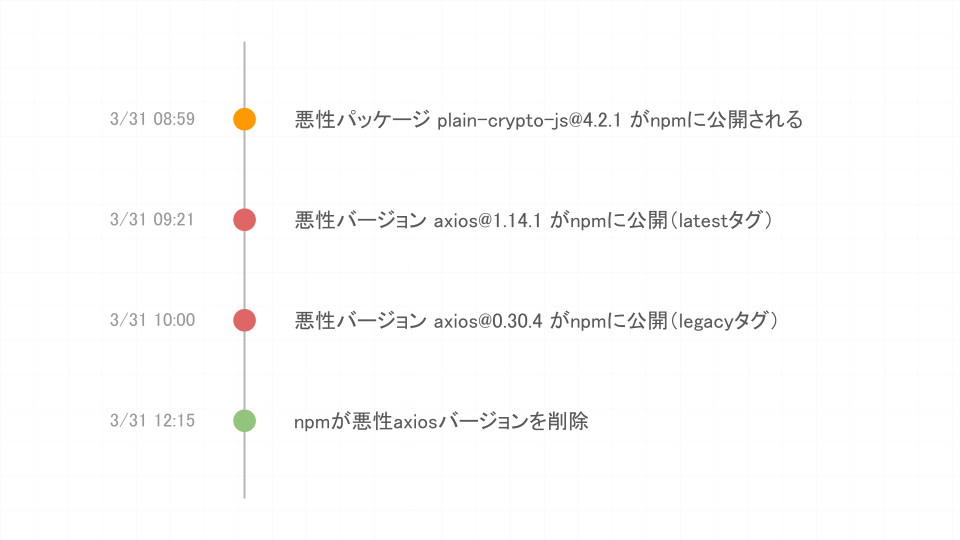 一連のインシデントは日本時間の3月31日の9時ごろから12時ごろに終了しました。悪性の「axios@1.14.1」の露出時間は約2時間53分、「axios@0.30.4」は約2時間15分と推定されます。