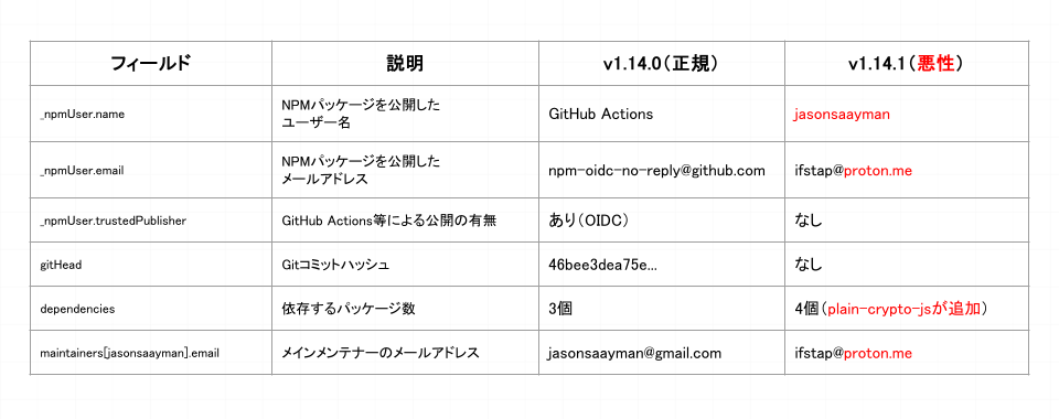 正規版(v1.14.0)と悪性版(v1.14.1)のnpm registryのマニフェストを比較すると、以下の差異があります。
