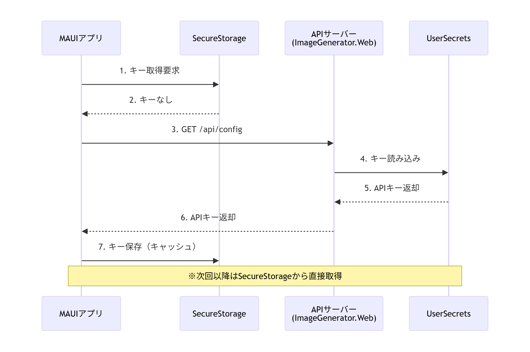この機能を、これまでと同じく、インターフェイスで抽象化し、DIで差し替える形で実装します。このAPIサーバー経由でのキー取得の流れをシーケンス図にすると、次のようになります。