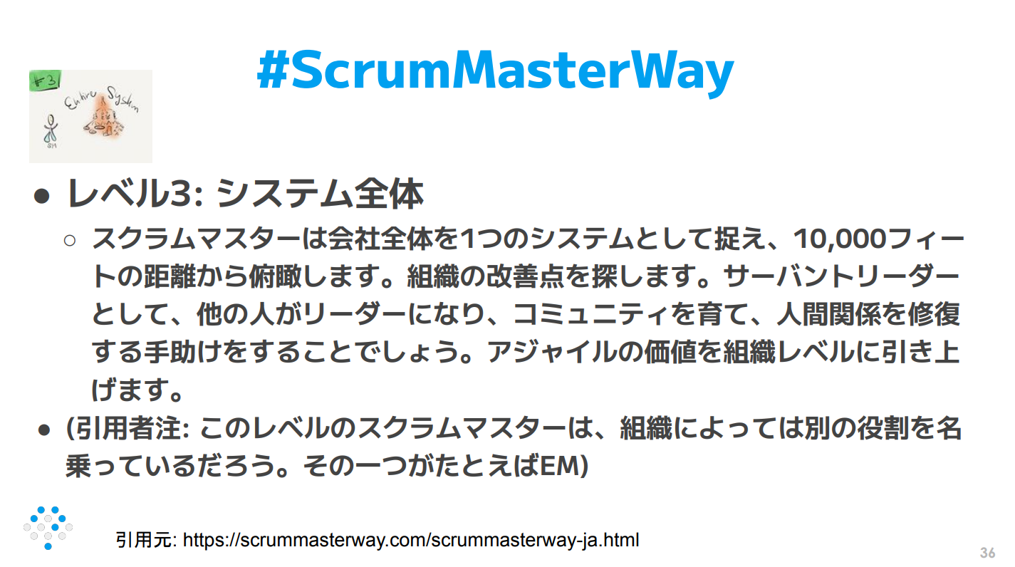 「このレベル3まで行くと、もうスクラムマスターとは呼ばれていない。そのうちの一つが、EMであってもいいと思う」という粕谷氏の見立ては、スクラムマスターとEMが本質的に重なっていることを指摘している。