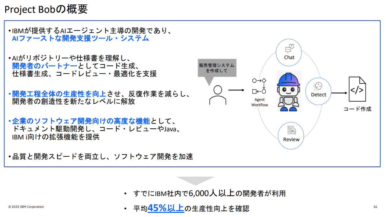 特に注目を集めたのは、AIエージェントが要件定義からコード生成、レビューまでを自律的に支援する開発ツール「Project Bob」の詳細だ。