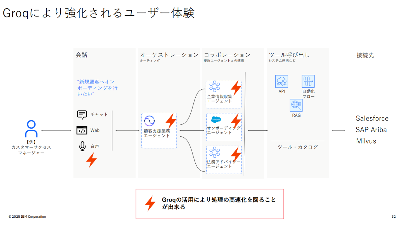 もう一つの大きなトピックは、AIエージェントの実行基盤である「IBM watsonx Orchestrate」の強化だ。日本IBMはGroq社との提携を発表し、同社のLPU(Language Processing Unit)をwatsonx Orchestrateから利用可能にした。