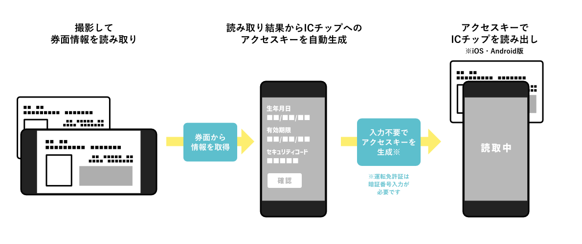 同ライブラリは、スマートフォンのカメラ撮影による券面読み取りからICチップの読み出しまでを自動化する。カメラ画像からアクセスキーを自動生成し、手入力せずに情報抽出を実現した。