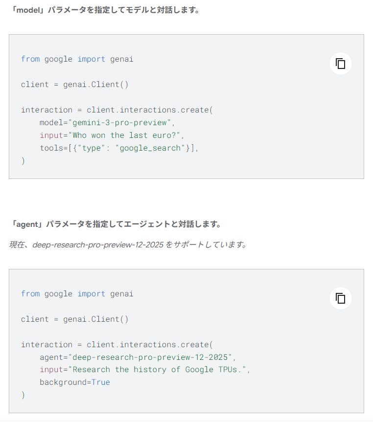 加えて、メッセージや思考、ツールの呼び出し等を整理して扱えるデータモデルや、長時間実行タスクのバックグラウンド処理もサポートする。今回のβ版では、リサーチタスク向けの組み込みエージェント「Gemini Deep Research」も試用可能だ。