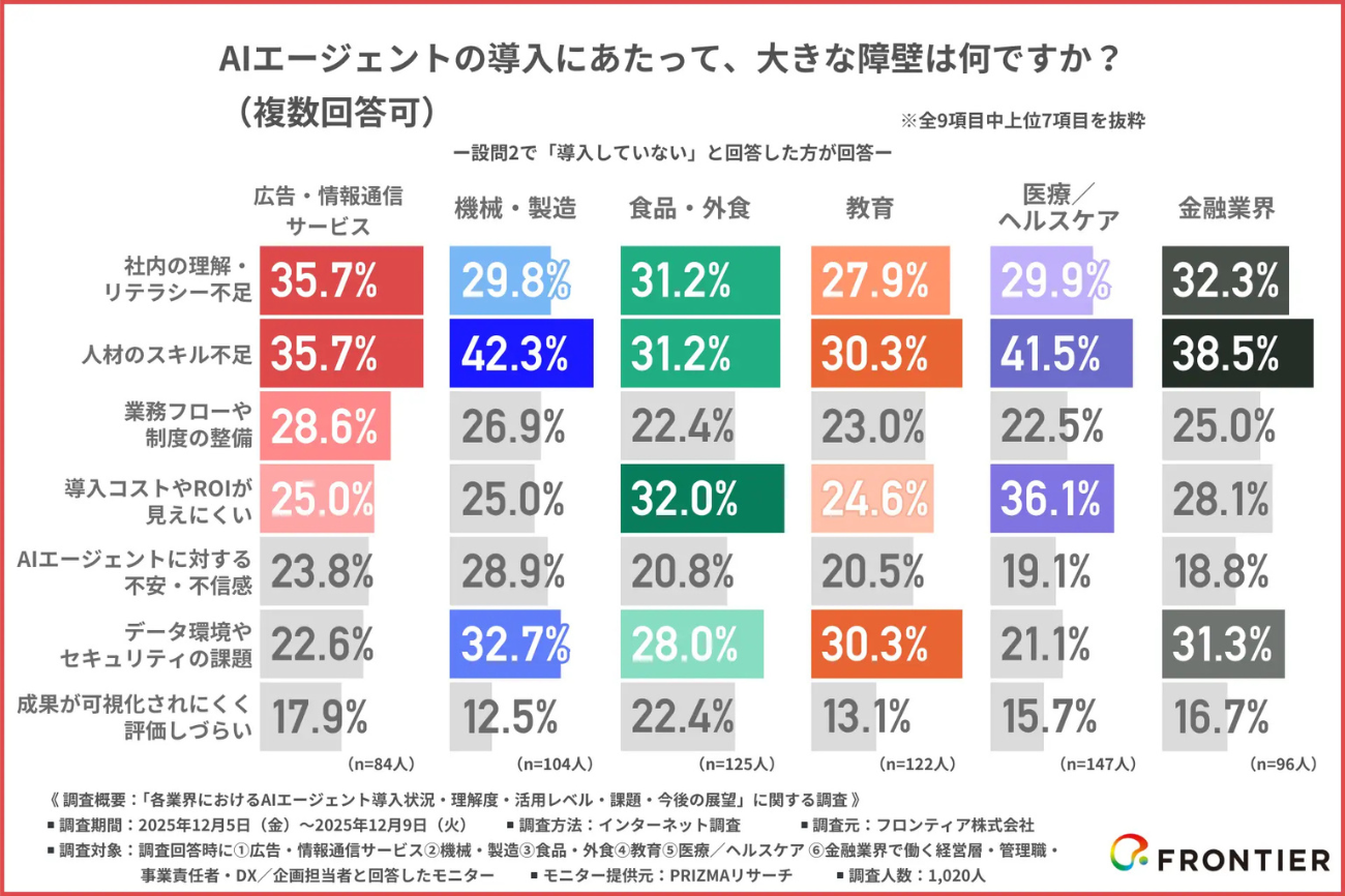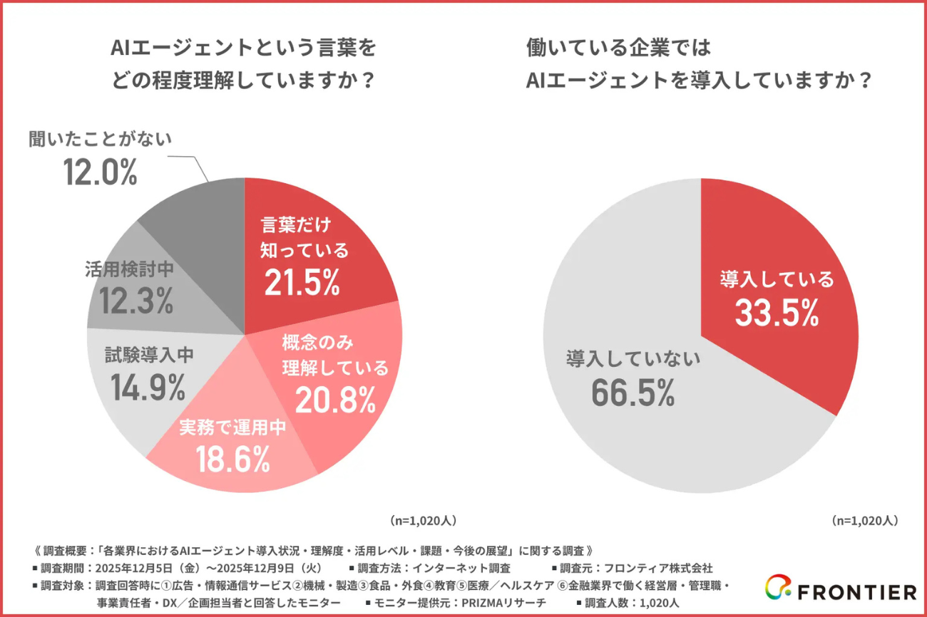 2025年12月23日、フロンティアは広告・情報通信、製造、食品、教育、医療、金融業界で働く管理職・事業責任者など1,020名を対象に、AIエージェントの導入実態や課題に関する調査結果を発表した。