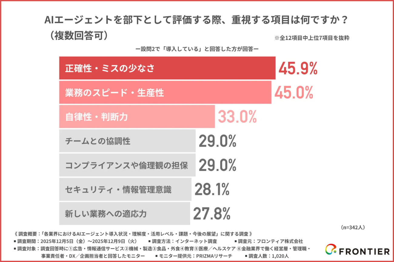 評価項目では「正確性・ミスの少なさ」(45.9%)、「業務スピード・生産性」(45.0%)が上位で、人間と同等の成果基準が求められている。