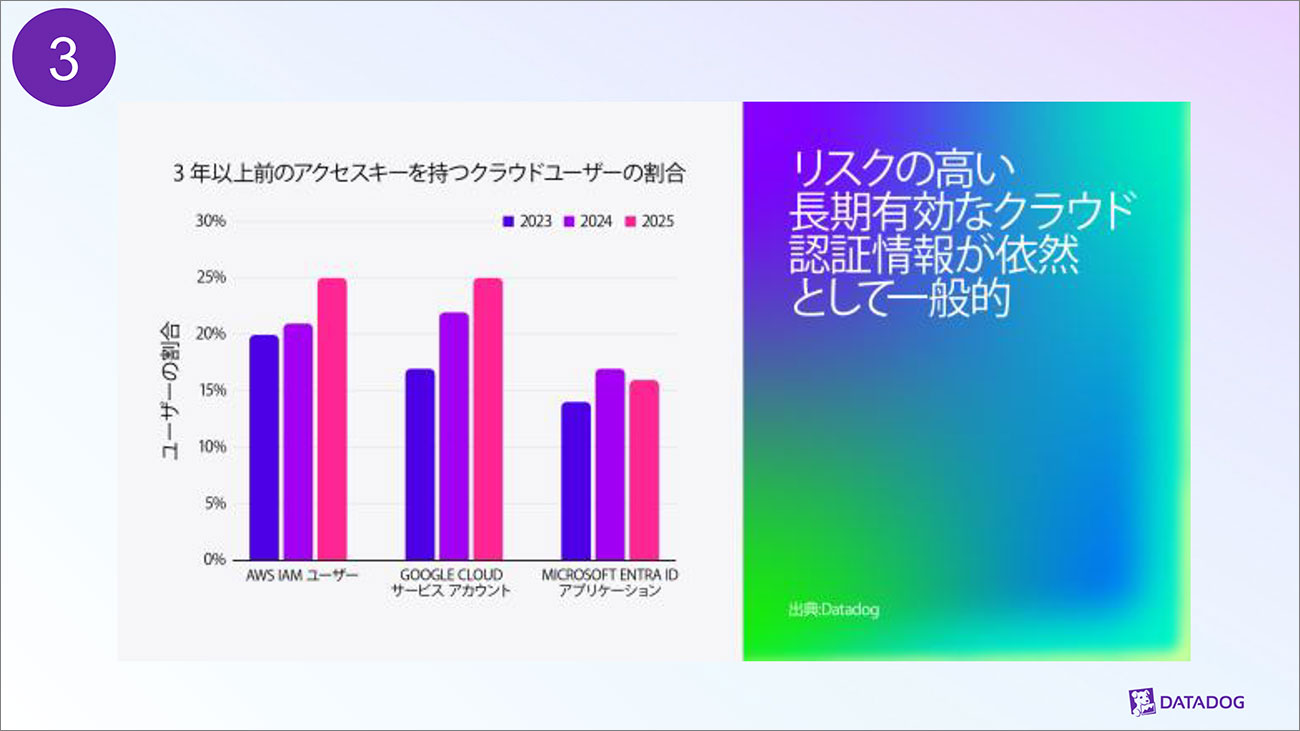 さらに、3年以上前のアクセスキーを保持し続けているクラウドユーザーの割合は、AWS IAM、Google Cloudにおいて前年より上昇しており、リスクの高い長期有効な認証情報が蔓延している実態が明らかになった。