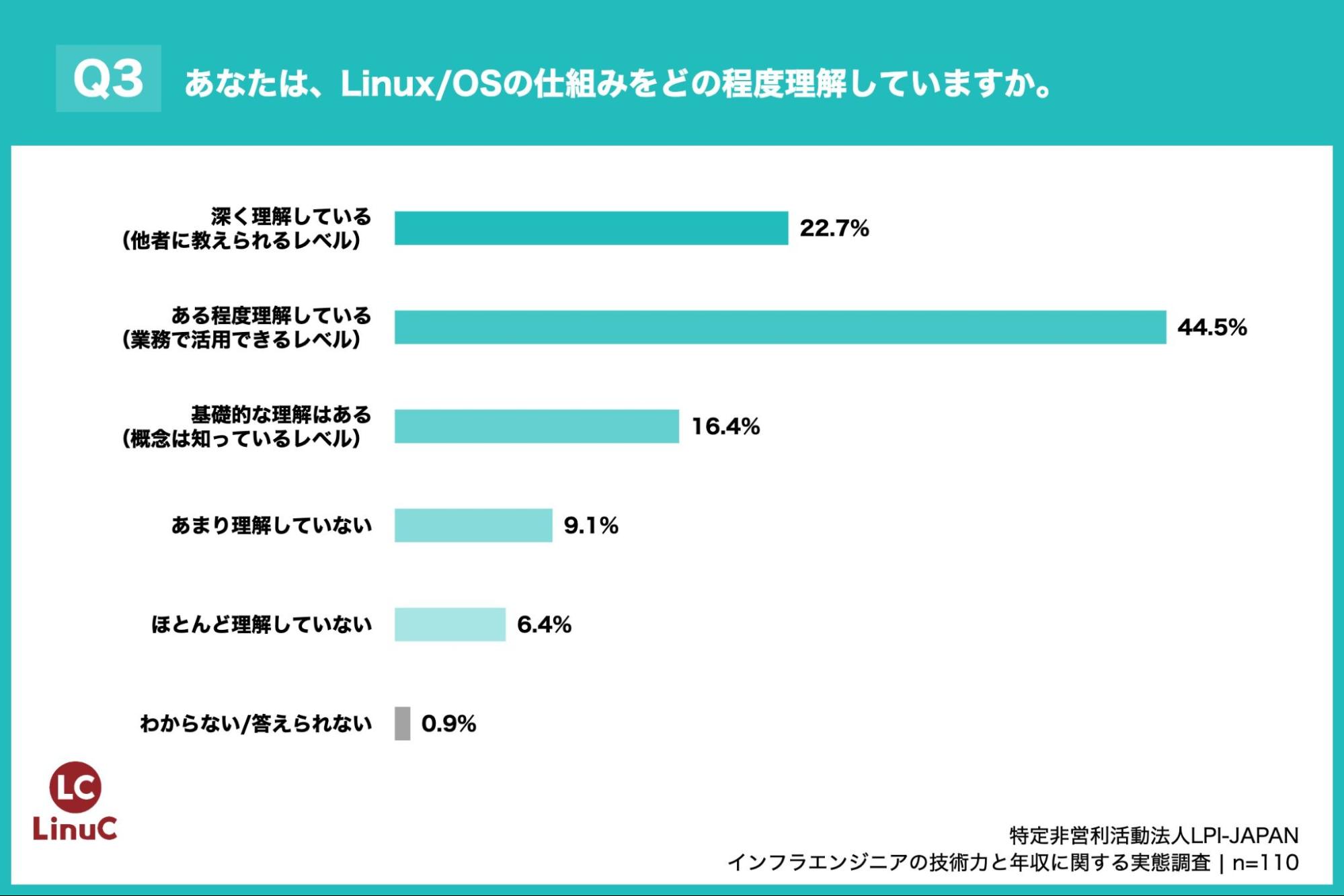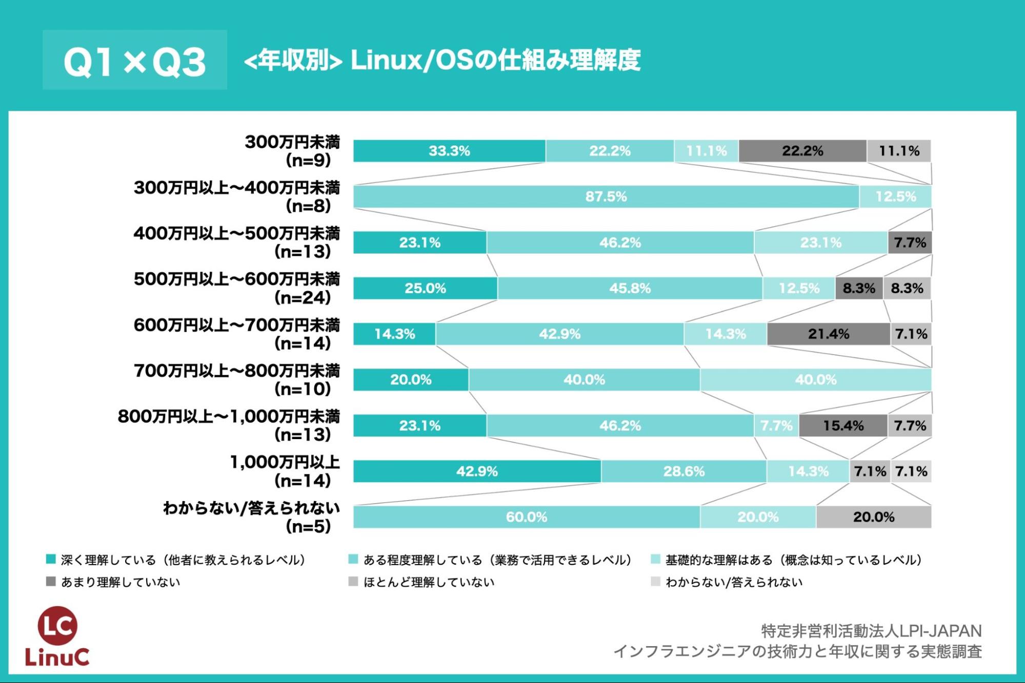 調査によると、46.3%のインフラエンジニアが年収600万円以上、12.7%が年収1,000万円以上となった。年収1,000万円超の層では、「Linux/OSの仕組みを深く理解している」との回答が42.9%と、全体平均(22.7%)の約2倍にのぼる。この結果、OSや基盤技術への深い理解が高収入に直結している傾向が示された。