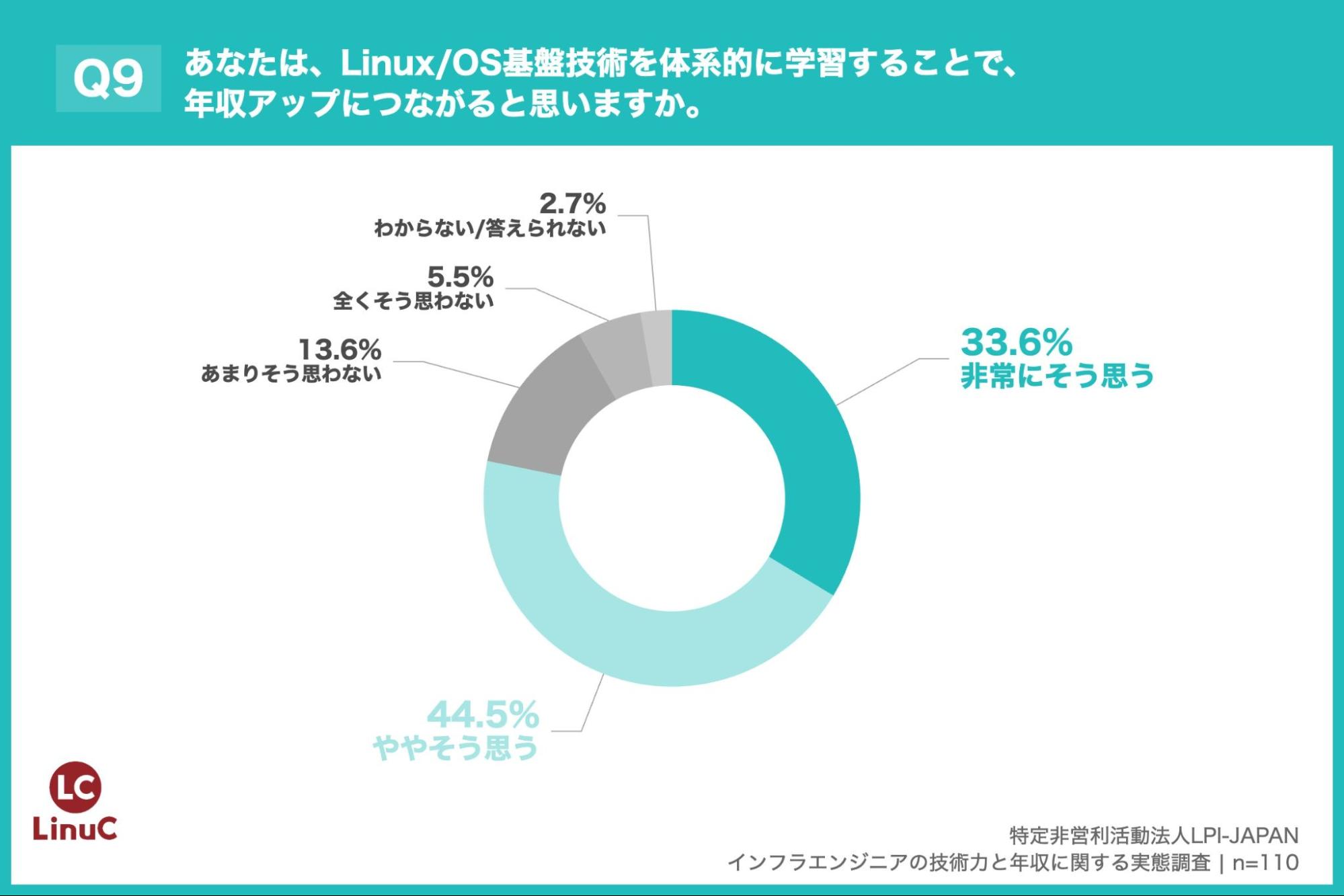 また、79.1%のエンジニアが「OS/基盤技術の知識・スキルが年収に影響する」と認識し、78.1%が「Linux/OS基盤技術の体系的な学習が年収アップにつながる」と回答した。一方で、年収アップに有効な取り組みとして「クラウド資格の取得」が49.1%で1位となり、「Linux/OS基盤技術の学習・資格取得」(30.9%)を大きく上回る結果となった。