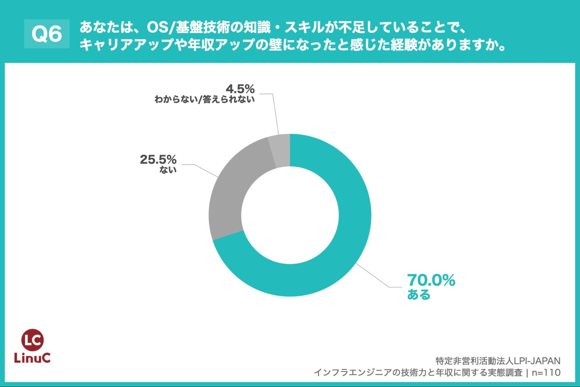 知識面では、67.2%がLinux/OSの仕組みを「業務で活用できるレベル以上」と回答。一方、70.0%のエンジニアが「OS/基盤技術の知識不足でキャリアアップの壁を感じた」としており、実際に「昇進・昇格で評価されなかった」(59.7%)、「希望するプロジェクトにアサインされなかった」(41.6%)などの具体的な壁を挙げている。