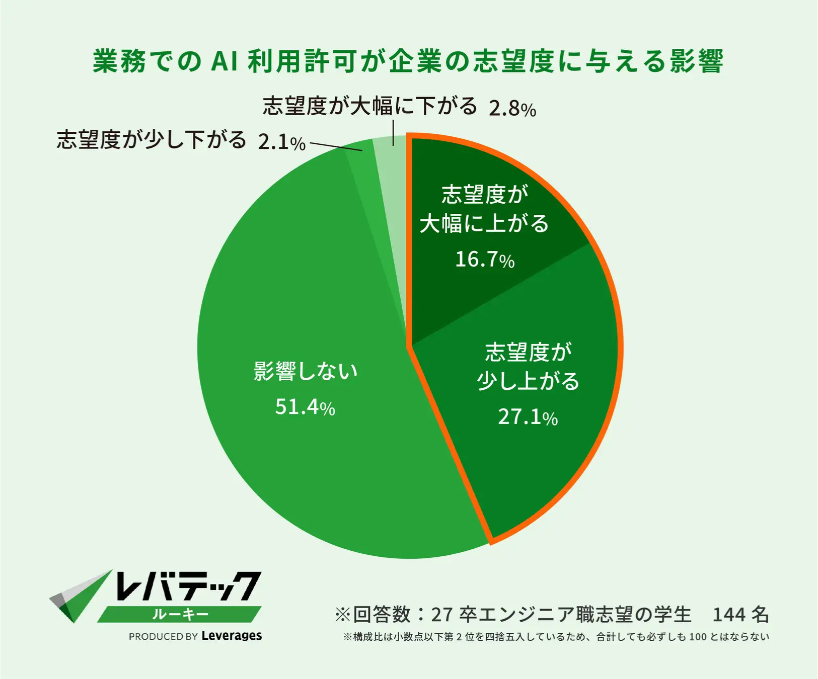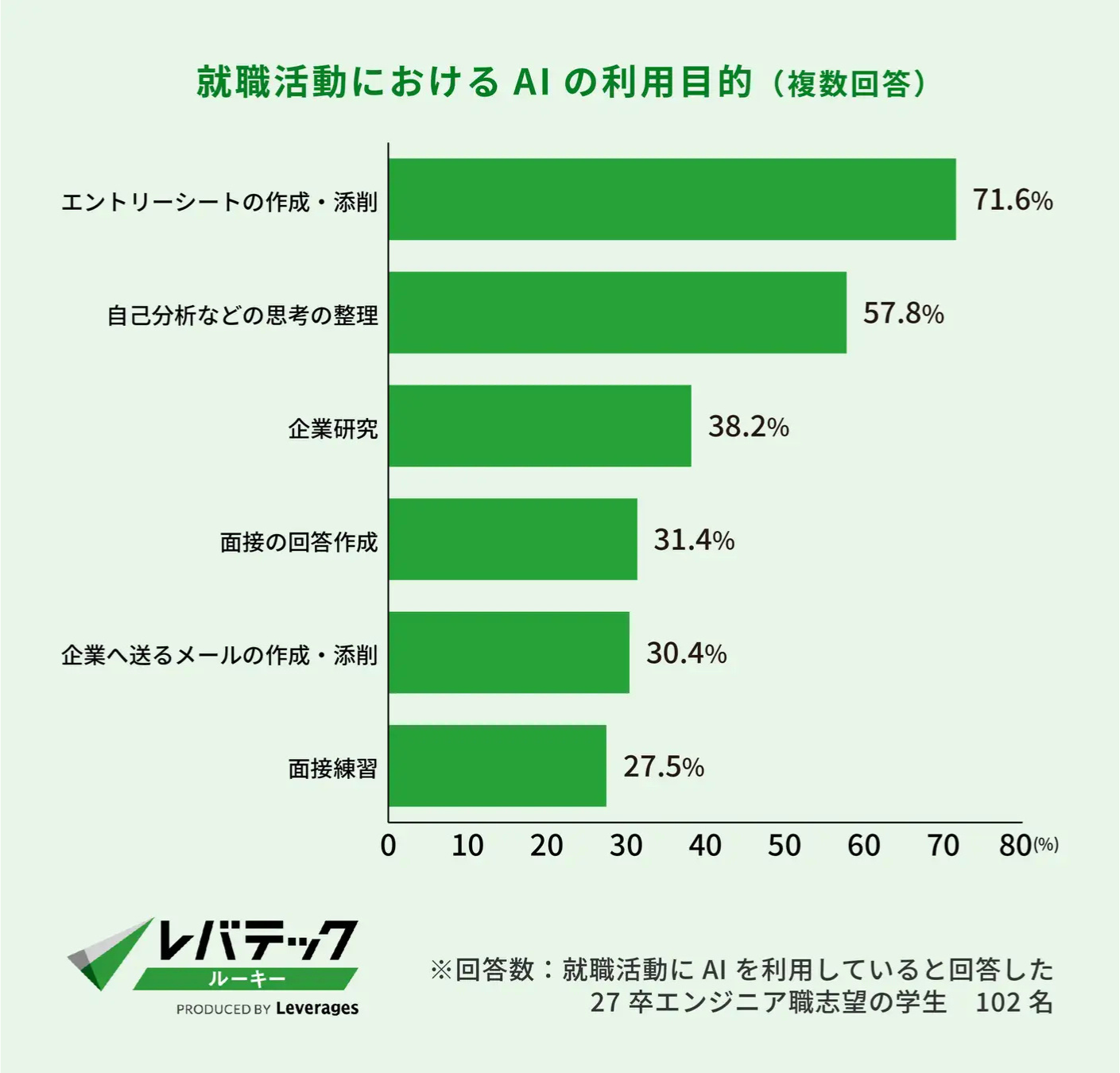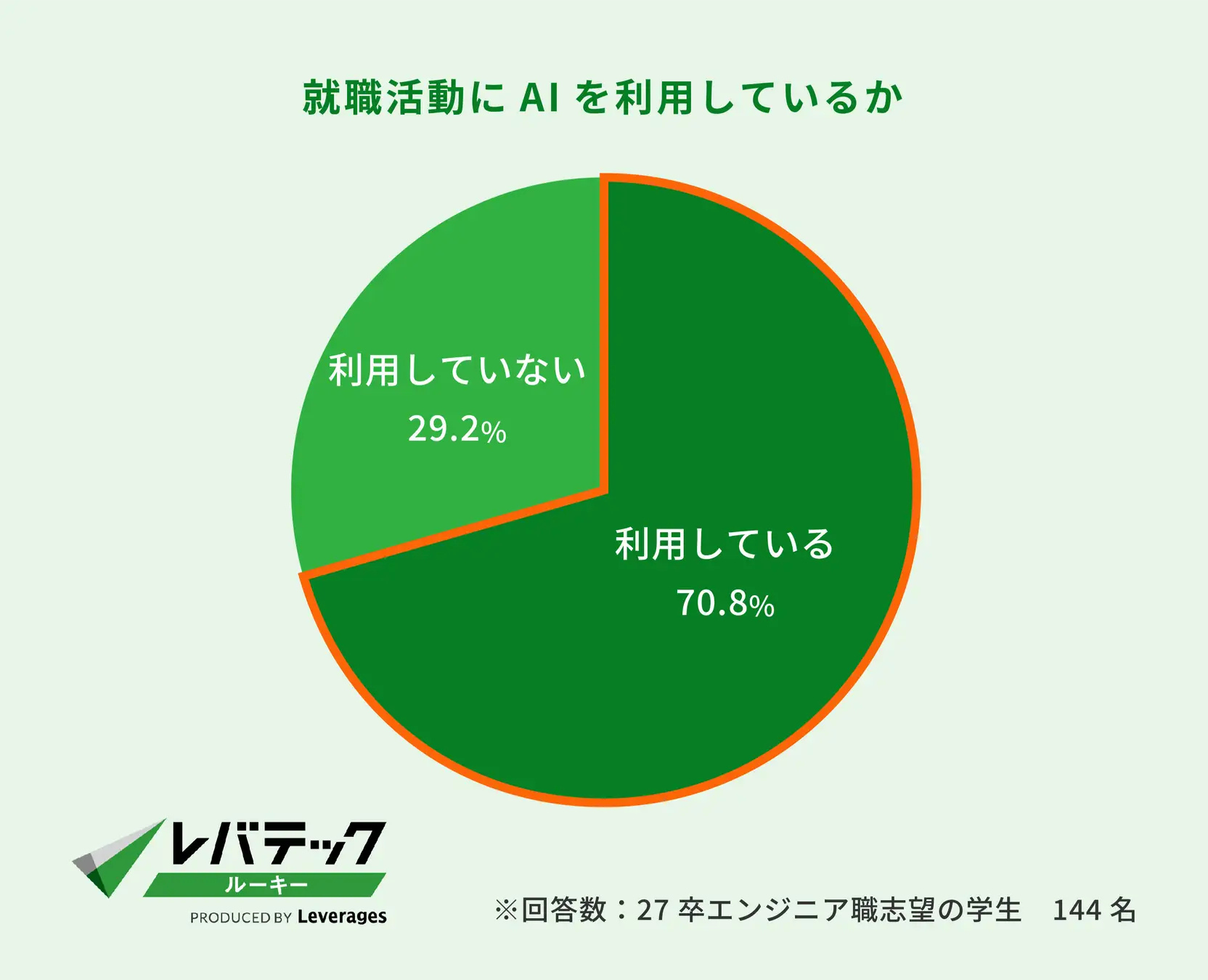 レバテックは2026年2月12日、2027年3月卒業予定のエンジニア職志望の大学生・大学院生144名を対象に実施した就職活動に関するAI利用状況調査の結果を発表した。それによると、就活にAIを「利用している」と回答した学生は70.8%に上り、昨年度(47.2%)から20ポイント以上増加した。