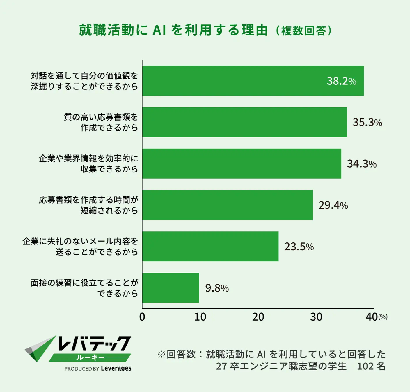 AIを利用する主な目的は「エントリーシートの作成・添削」(71.6%)が最多で、「自己分析などの思考の整理」(57.8%)、「企業研究」(38.2%)も多い。利用理由として、「自分の価値観を深掘りするため」「質の高い応募書類を作成できるため」などが挙がり、AIを単なる作業効率化だけでなくアウトプットの質向上にも用いている傾向がみられる。