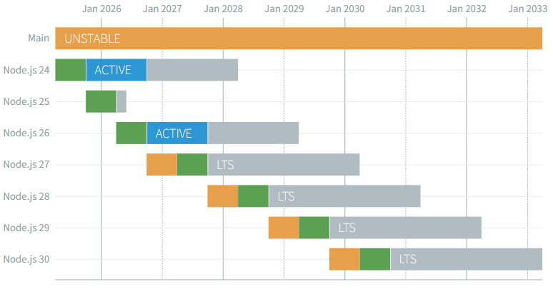 Node.js 27(2027年4月リリース)が新スケジュールの第1弾となる。開発者は今後の移行に備え、新しいリリースサイクルへの対応準備が求められる。