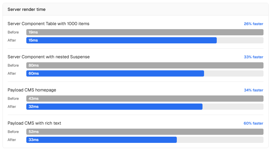 まずパフォーマンス面では、開発時の「next dev」起動速度が従来比約4倍、レンダリング速度も実運用下で25~60%向上した。これはReact Server Componentsのペイロードデシリアライズ高速化やTurbopackの200件超の修正が寄与している。