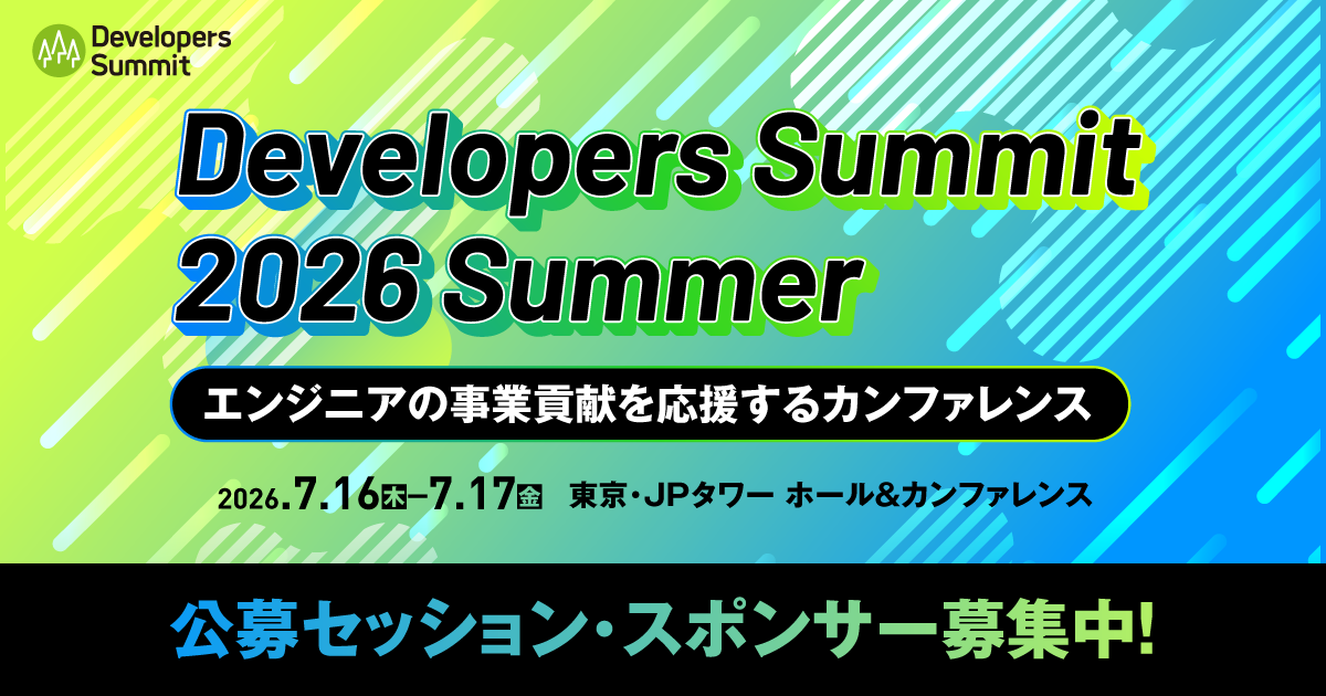 Developers Summit 2026 Summerのテーマ「エンジニアの事業貢献を応援するカンファレンス」のもと、いかにエンジニアリングに基づいた意思決定を行い、事業価値につなげていくか、最前線の情報を交換する機会を作ります。