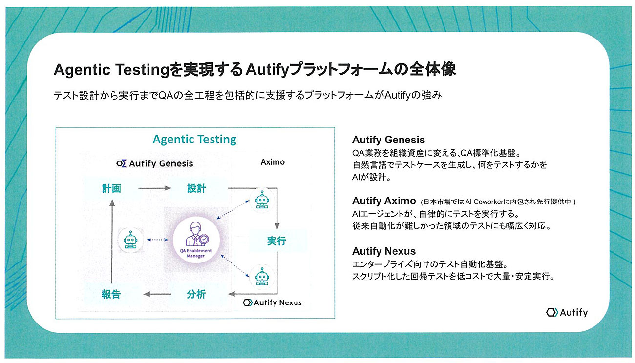 AIを用いたソフトウェアテスト自動化プラットフォームを展開するオーティファイは、「Autify QA-AX Vision 2026 品質保証の未来を再定義する」と題した事業戦略説明会を、4月16日に開催した。同社はQA(品質保証)について、手段ではなく“あり方”を変える「QA-AX(Quality Assurance AI Transformation)」をビジョンとして掲げている。その一環として、QA(品質保証)業務の標準化プラットフォーム「Autify Genesis」の新バージョンをリリースした。